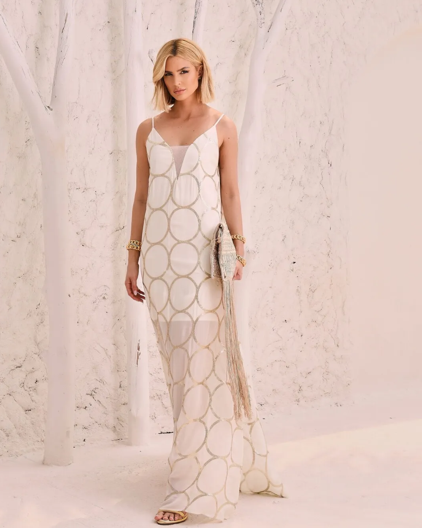 Este vestido é finalizado com tassels que adicionam textura e dinamismo, criando um efeito de movimento único a cada passo. O acabamento impecável eleva a peça, tornando-a perfeita para quem busca sofisticação com um toque de personalidade e estilo.